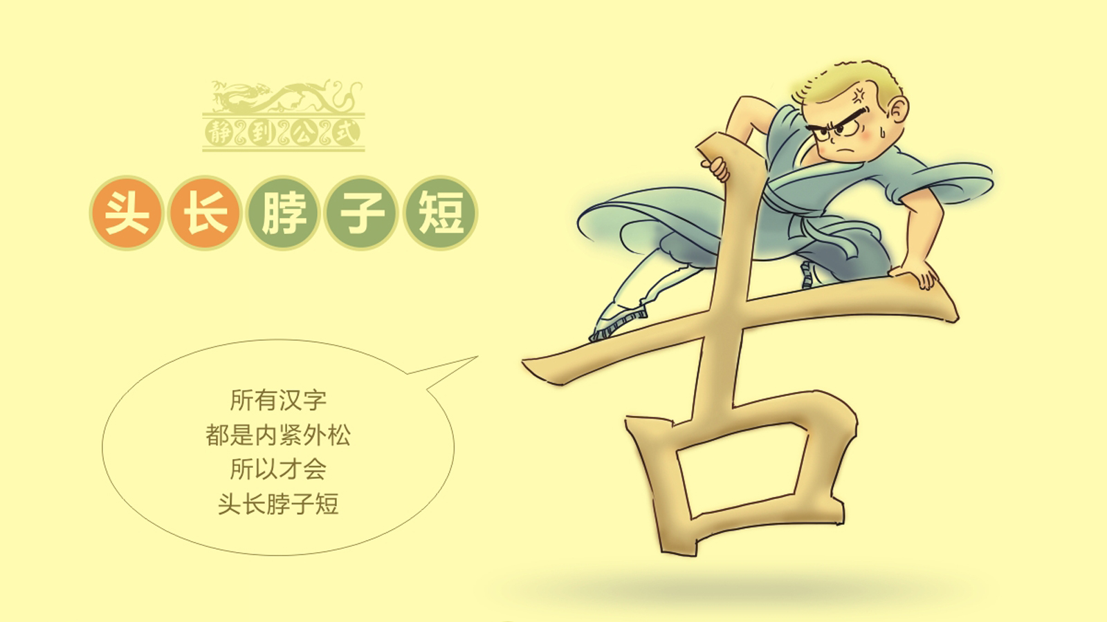 目前,市面上所有教材都无法解释为什么要这么写字?而《静到书法公式》会告诉你所有的汉字只要左边小就要升上去,右边小就要降下来。再配合动画解释为什么《左小偏上,右小偏下》让学生恍然大悟,获得举一反三的能力。